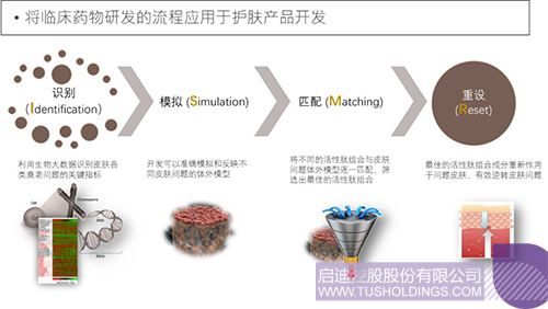 二、 功效成分篩選平臺。將臨床藥物研發的流程應用于護膚產品開發,針對不同皮膚衰老問題,建立集識別(Identification)、模擬(Simulation)、匹配(Matching)以及重設(Reset)為一體的I.S.M.R的流程。在此基礎上與分泌型天然多肽因子庫有機結合,目標導向化高效篩選創新型多肽成分組合。