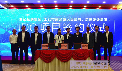 在太倉市副市長胡捷,璜涇鎮黨委書記吳建國,世紀互聯CEO、總裁王世琪,世紀互聯副總裁申成鋼,啟迪設計董事長、黨委書記戴雅萍,啟迪設計總裁、總建筑師查金榮等領導的見證下,世紀互聯副總裁、華東區總經理蔡春風與太倉璜涇鎮鎮長李天一,啟迪設計副總裁、董事長辦公室主任華亮就太倉云數據中心項目正式簽約。