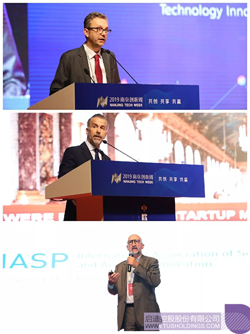 Michele Cecchi、Javier Gimeno、Luis Sanz、陳鴻波、沈童剛、湯浩應(yīng)南京市人民政府邀請,參加了當(dāng)天上午由南京市人民政府主辦的紫金山創(chuàng)新大會暨2019南京創(chuàng)新周開幕式活動,并應(yīng)邀與南京市相關(guān)領(lǐng)導(dǎo)會談,就推動國際合作達(dá)成共識。