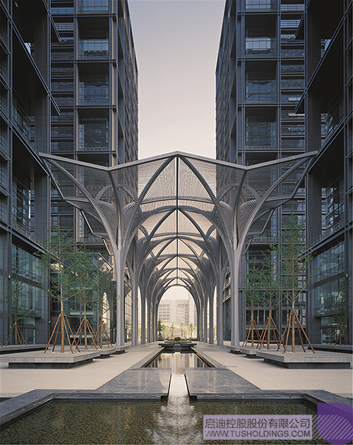 分列的四塔間隙為城市道路通向園區(qū)中心綠地打開(kāi)了一條綠色通廊,中心是12顆參天鋼樹(shù),形成灰空間的限定,與二層平臺(tái)自然的樹(shù)木共同營(yíng)造出積極的公共交往空間。“樹(shù)影婆娑”下是綠意盎然的休閑廣場(chǎng),展現(xiàn)人與自然共生共融的景象。建筑首層斜插入地下的草坪,標(biāo)準(zhǔn)層四角的綠色陽(yáng)臺(tái)和頂層白色膜傘的屋頂花園無(wú)不體現(xiàn)了人性化、生態(tài)化的現(xiàn)代商務(wù)辦公理念。